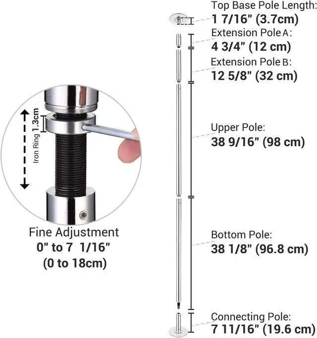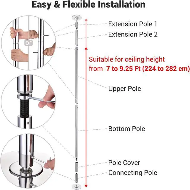 - Easy & Flexible Installation - 2 Packs of 9.25FT extendable spinning dancing poles feature easy height adjustment with the use of extension poles to accommodate a range of ceiling heights from 7 to 9.25 Ft, along with a simple installation procedure with no-drilling required to put up or take down, preventing damage to your ceiling and floor