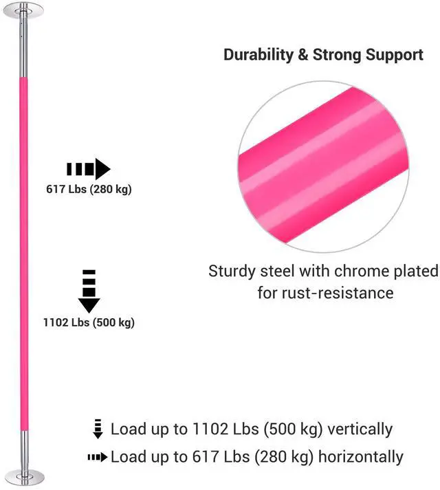 - Sturdy Steel Construction - Made of sturdy steel with chrome plating for exceptional durability and rust-resistance, it boasts a market-leading load capacity of up to 1102 Lbs vertically and 617 Lbs horizontally, suitable for dancers of all ages and sizes, while upgraded silicone surface on the entire pole for preventing slips by sweaty hands when doing moves