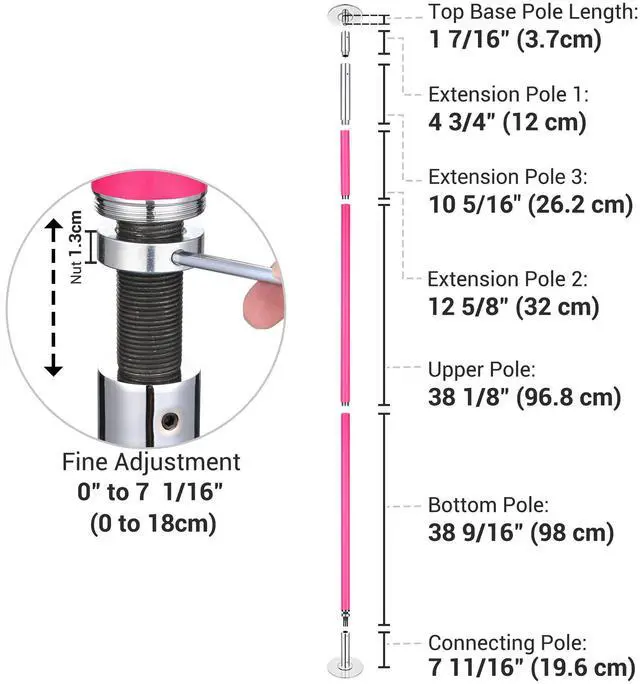 - Dancing Pole with Extension Kit - 10.1 Ft Stripper Pole Kit includes a spinning dancing pole and 4 3/4", 12 5/8", 10 5/16" extension poles, one full set for accommodating varied ceiling heights, meeting different installation needs for home, clubs, discos, stage