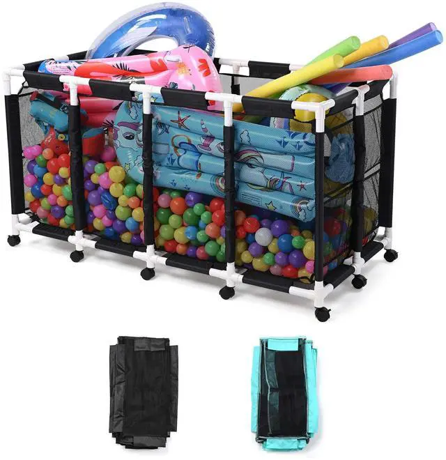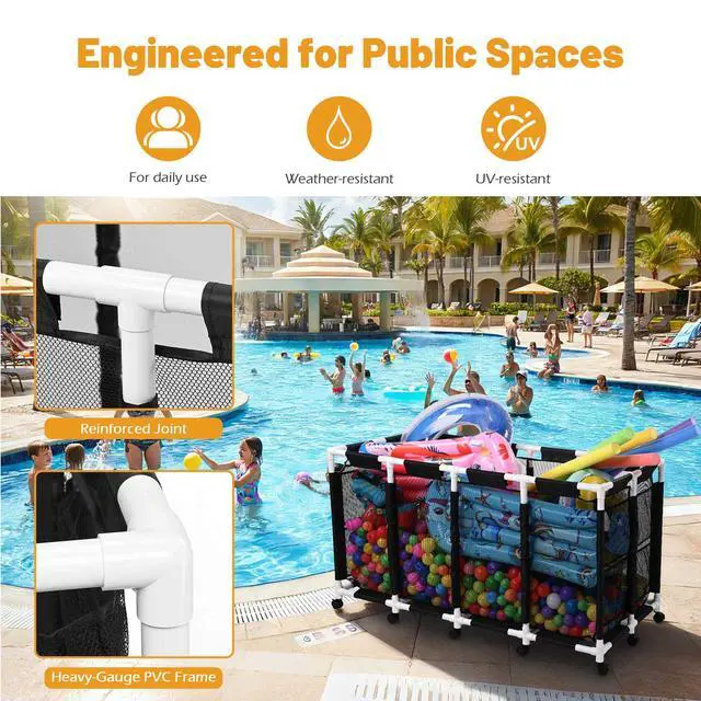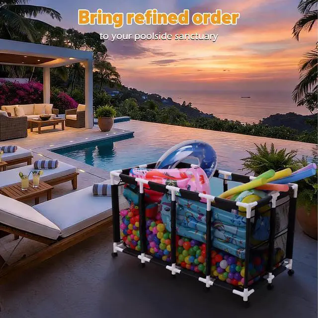 - Massive 274-Gallon Capacity - Picture all your pool toyssurfboards, loungers, floaties, and noodlesneatly consolidated into one organized station. With added side pockets for goggles and sunscreen, this storage bin is the ultimate solution for maintaining the clean, luxurious aesthetic demanded by resorts and upscale villas