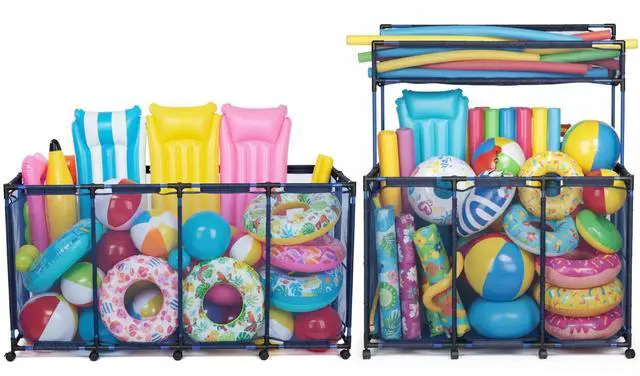 - 2-Tier Basket - Comes with 33Lbs weight capacity for providing spacious space for storing large inflatable toys, floats and more, along with side pockets for keeping goggles and towels in place, also comes with a top noodle holder for pool noodles and long items, saving more space and allowing easy access