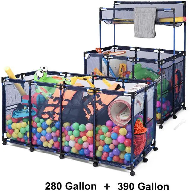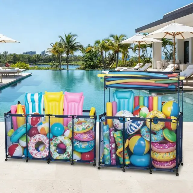 - Portability & Wide Application - This mesh pool storage bin kit includes a 2-tier storage cart measuring 49 7/16" x 30 1/2" x 61" in size and a 65"x30"x33" storage cart for keeping pool noodles, swimming rings, balls and other accessories