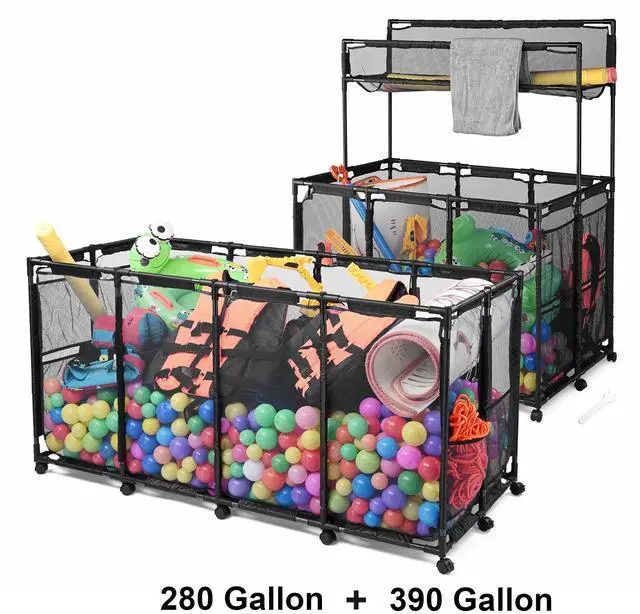 - Portability & Wide Application - This mesh pool storage bin kit includes a 2-tier storage cart measuring 49 7/16" x 30 1/2" x 61" in size and a 65"x30"x33" storage cart for keeping pool noodles, swimming rings, balls and other accessories in home or public swimming pools