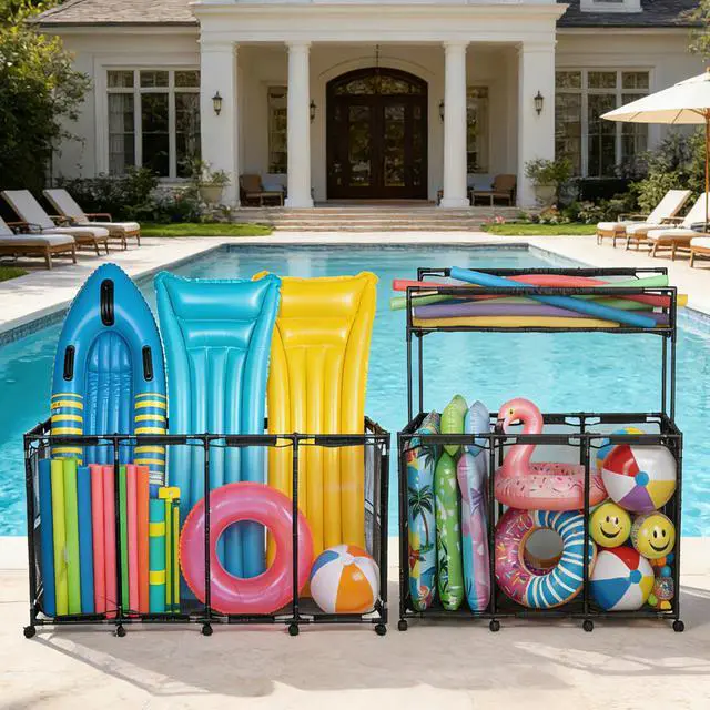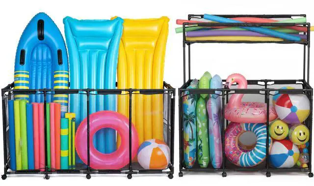 - 2-Tier Basket - Comes with 33Lbs weight capacity for providing spacious space for storing large inflatable toys, floats and more, along with side pockets for keeping goggles and towels in place, also comes with a top noodle holder for pool noodles and long items, saving more space and allowing easy access
