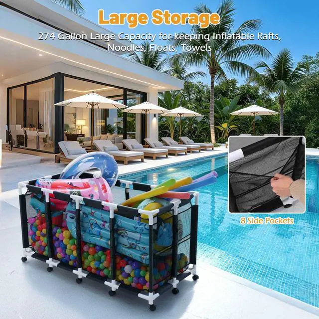 - Massive 274-Gallon Capacity - Imagine a pristine pool deck where every surfboard, lounger, and noodle disappears into sleek, organized storage. With spacious main compartments and dedicated pockets for goggles and sunscreen, this storage bin maintains the serene, luxurious aesthetic