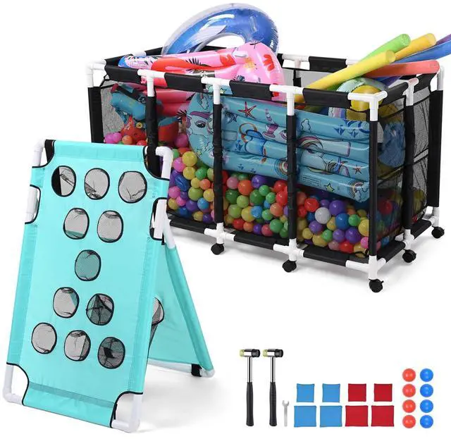 - Poolside Storage & Entertainment - This kit includes a mesh pool storage bin and a toss game board, one full set to create a clutter-free oasis while enjoying instant pool fun. The extra-thick, large-diameter white PVC frame outperforms standard metal frames, delivering 88Lbs load-bearing capacity while remaining 100% rust-proof