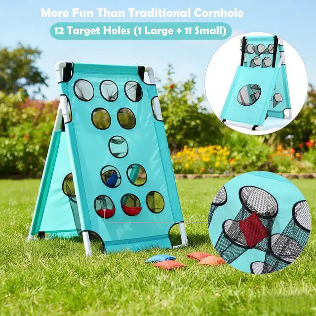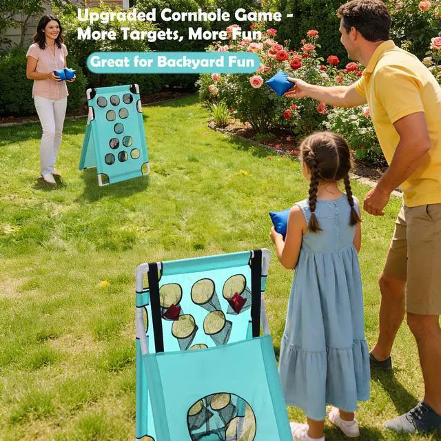 - Fun For All Ages - Each board features 11 small target holes + 1 large hole (12 holes total). Easier for all-aged groups and beginners to score points. Includes 16 balls and 16 bean bags,enough for two teams to play simultaneously. No waiting, more playing. Ideal for family reunions, birthday parties, and multi-generational gatherings