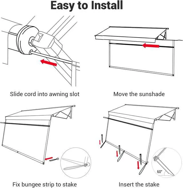 - Easy to Install - Easy installation within minutes by sliding the cord into awning slot and moving the sun shade, with ground stake provided for fixating the sun shade stably into ground
