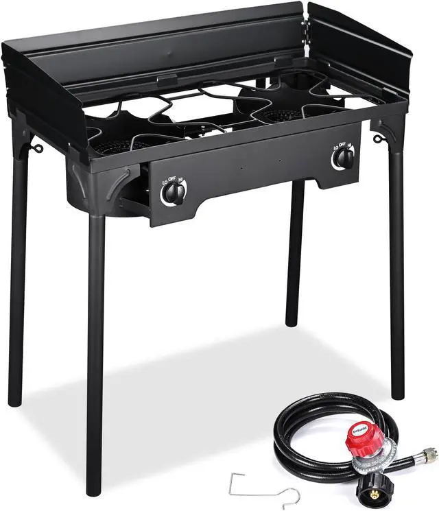 - Powerful Heating - Dual Burner Stove features max. output of 75,000 BTU for each burner (total 150,000 BTU) to meet different cooking needs such as frying and toasting, along with 2 knobs for separately controlling 2 burners and adjusting the flame intensity; Features a CSA certificated regulator with adjustable air pressure from 0 to 20 PSI for getting suitable gas output to prevent wasting gas or ignition difficulty