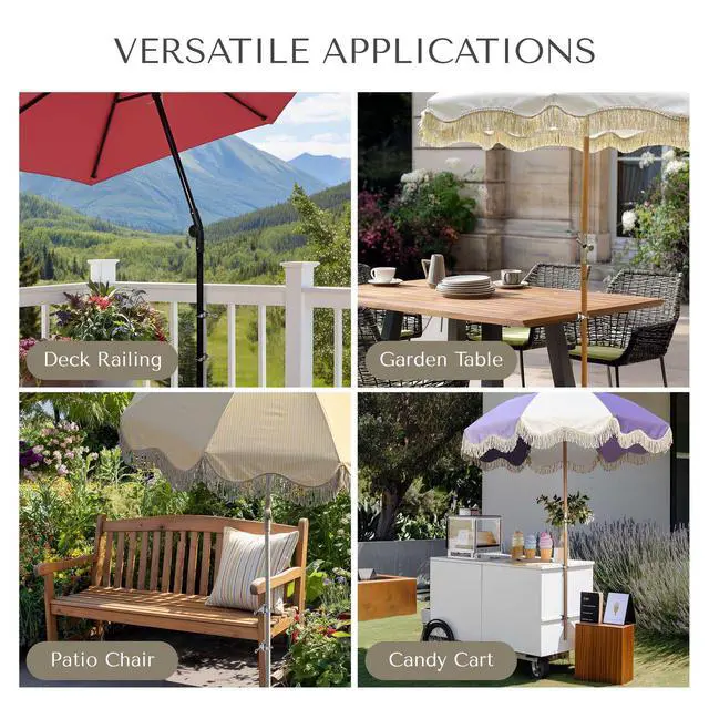 - Easy to Reposition - The umbrella clip can be removed at any time without any tools, enabling convenient repositioning in a variety of settings, such as outdoor dining areas, patios, balconies, bleachers, benches, fences, pool decks, railings