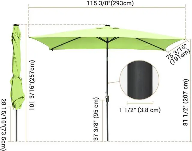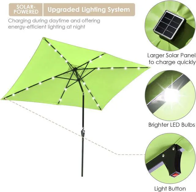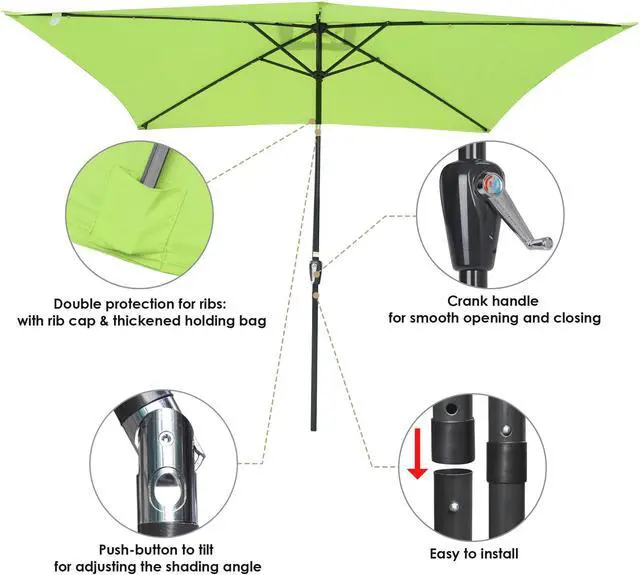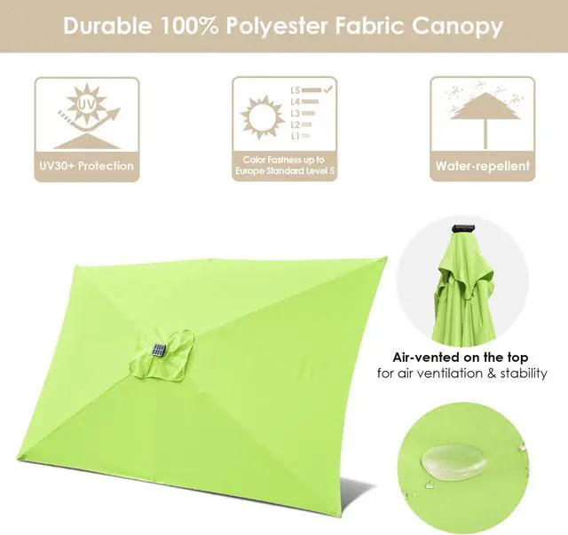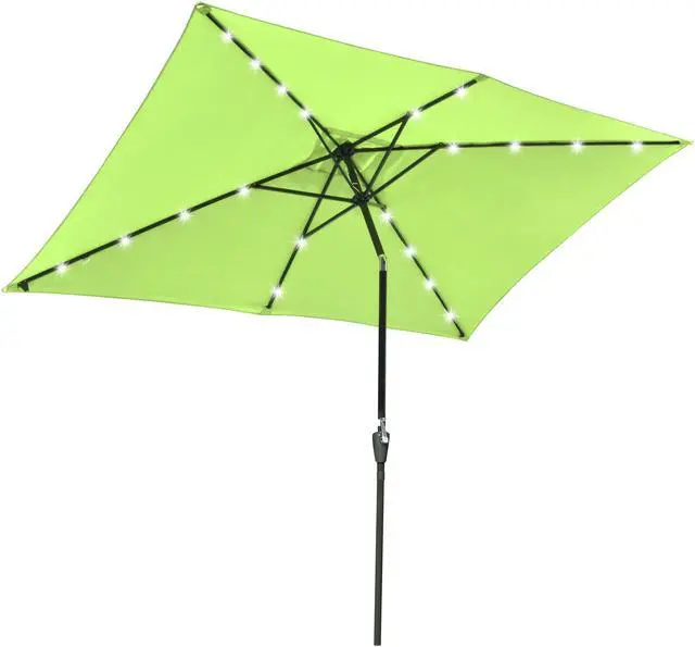 - All-purpose Umbrella - 10x6.5ft Rectangular Green Patio Umbrella with LED Lights meets your outdoor shading needs and decorates your garden, patio, deck, etc., allowing you and your family to lie under the umbrella along the poolside for relaxing at night, or enjoying night chatting and drinking with friends during weekend gathering