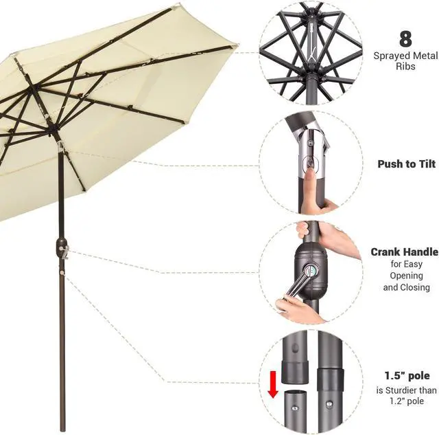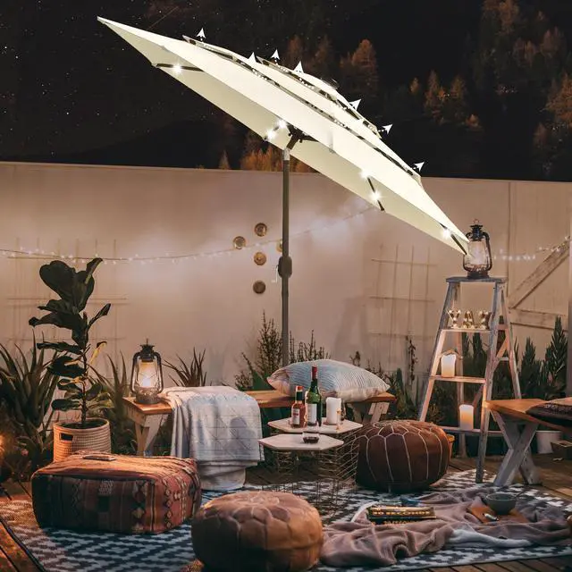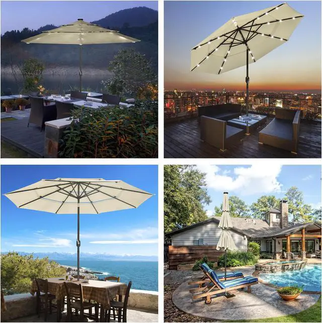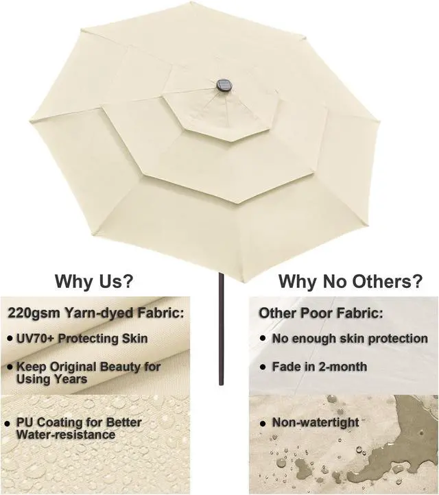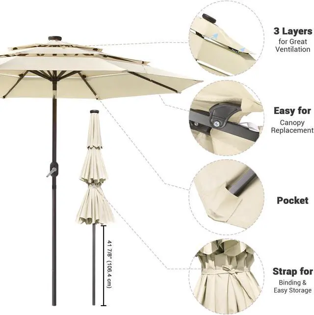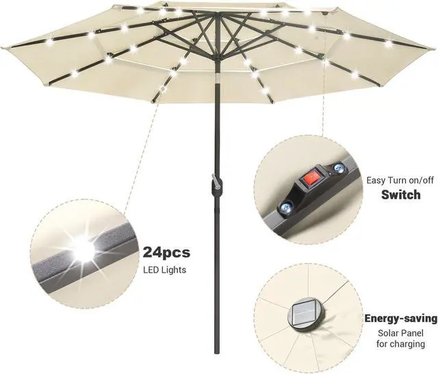- Energy-saving Solar LED Umbrella - 9 ft 3 Tier Patio Umbrella features LED lights on ribs, powered by solar panel, eco-friendly and energy saving