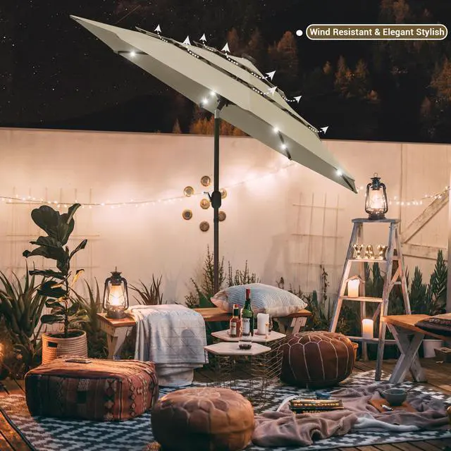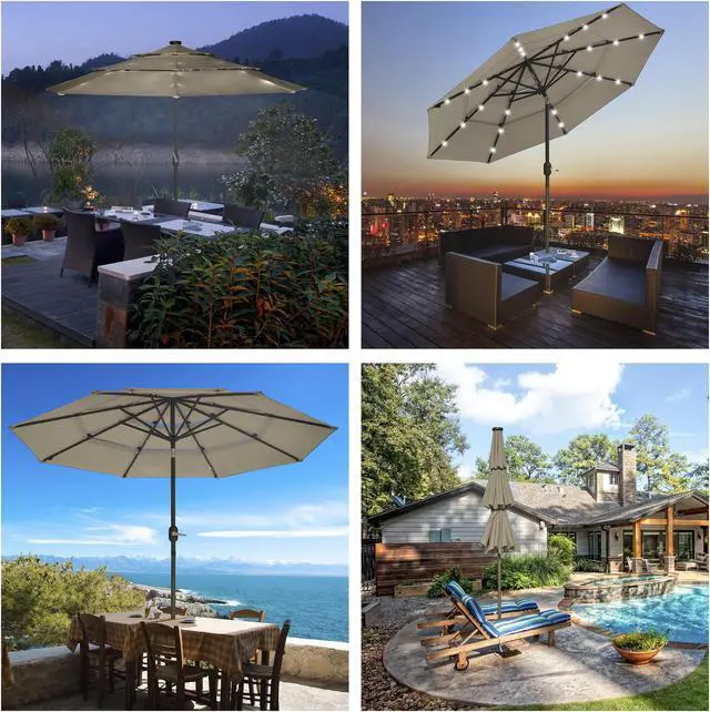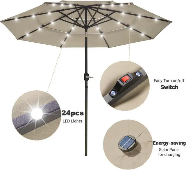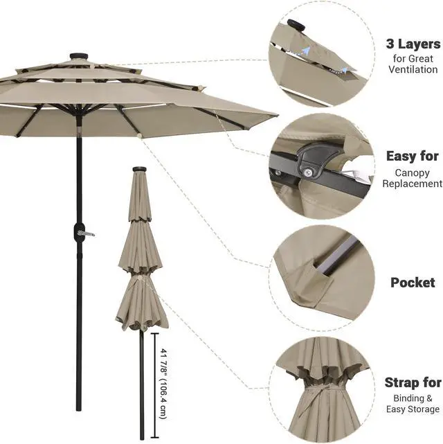 - Energy-saving Solar LED Umbrella - 9 ft 3 Tier Patio Umbrella features LED lights on ribs, powered by solar panel, eco-friendly and energy saving