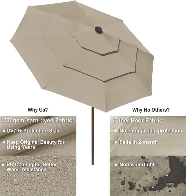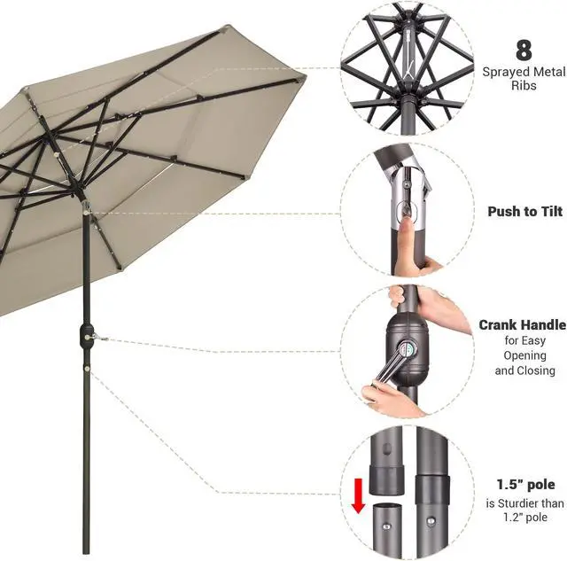 - Great Ventilation &; Stylish Appearance - 3 layers for great ventilation, keeps air flowing to offer better stability, also making the shading area cooler; Unique layered umbrella shows leisure style