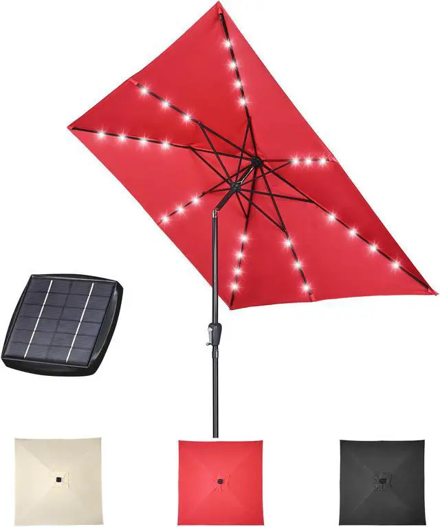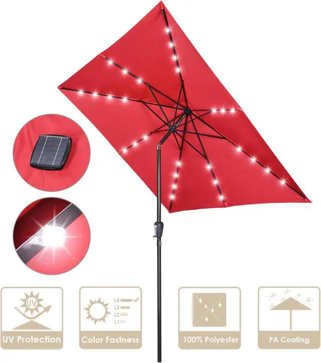 - Solar Powered Light System with USB Port - LED lights on ribs powered by solar panel, charging during daytime and lighting at dusk or night to save energy; USB port on the panel for emergency charging on cloudy days