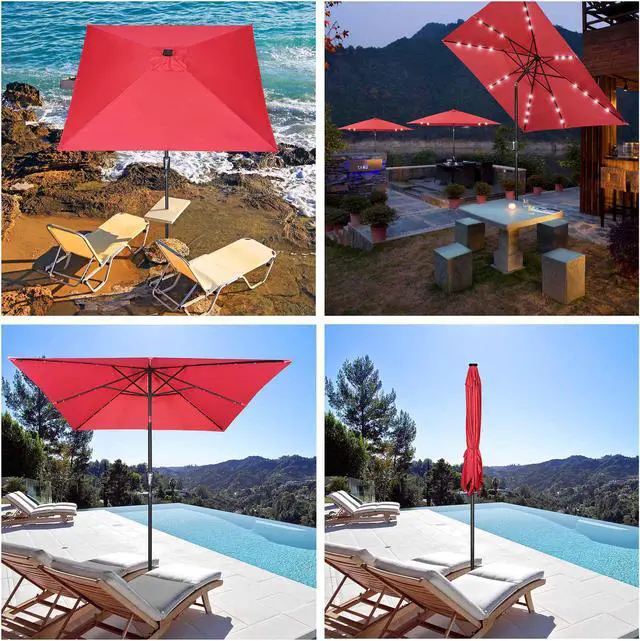 - Crank to Open & Push to Tilt - Effortlessly opening and closing the umbrella by turning the crank handle; Push the button to tilt umbrella for blocking sunlight from different angles; Also, a free strap included for binding canopy