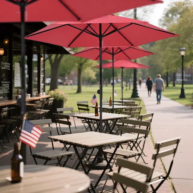 - Liberty Type Trio Umbrella Set - 9 Sets of 7.5ft Patio umbrella shades a 30" to 36" round table or 36" square table, offering ample shade and a delightful decor for your front patio, deck, backyard, or poolside, making it ideal for outdoor gathering, relaxing, alfresco dining, beer garden, and more