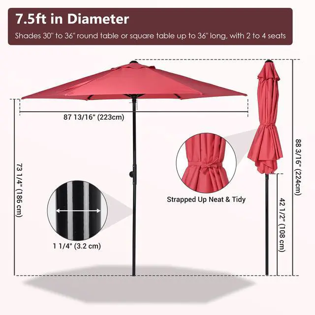 - Scale Design Tilt Mechanism - 7.5 ft Outdoor Patio Umbrella with Patented Easy Tilt Button provides 4-position angle adjustment, allowing you to block the sun from various positions throughout the day for maximum shade