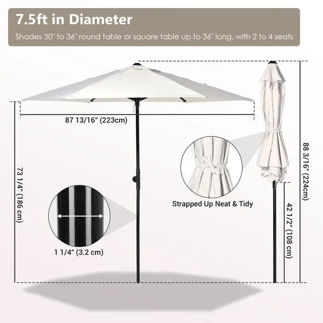 - Scale Design Tilt Mechanism - 7.5 ft Outdoor Patio Umbrella with Patented Easy Tilt Button provides 4-position angle adjustment, allowing you to block the sun from various positions throughout the day for maximum shade