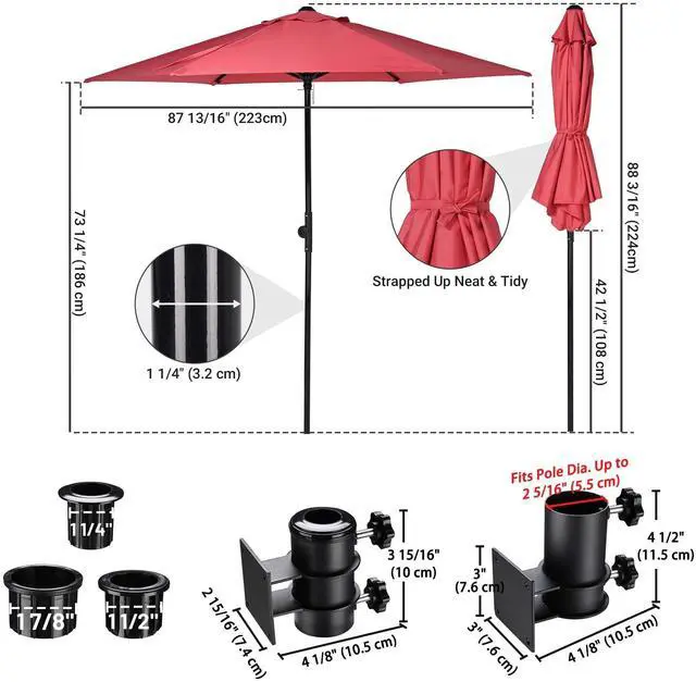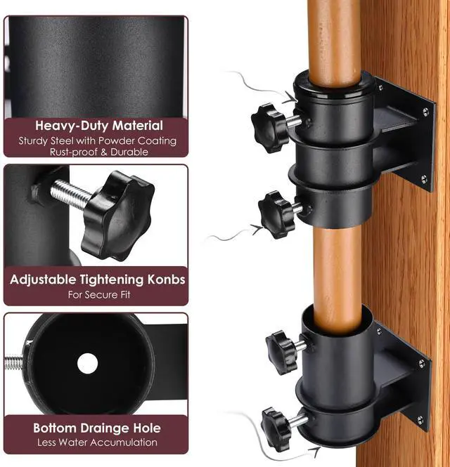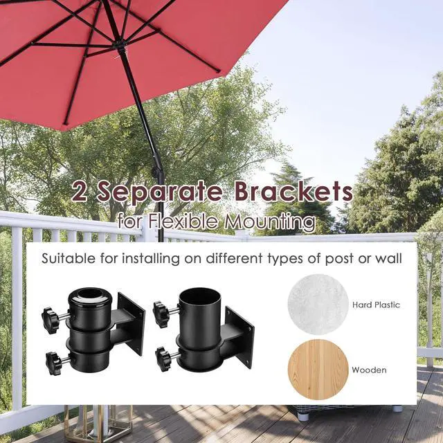 - Heavy Duty Universal Fit Brackets- Comes with a set of plastic sleeves to accommodate umbrella pole sizes from 1 1/4" to 2 5/16" in diameter; Crafted from sturdy powder-coated steel for rust resistance, this umbrella brackets are tough enough for longtime outdoor use,