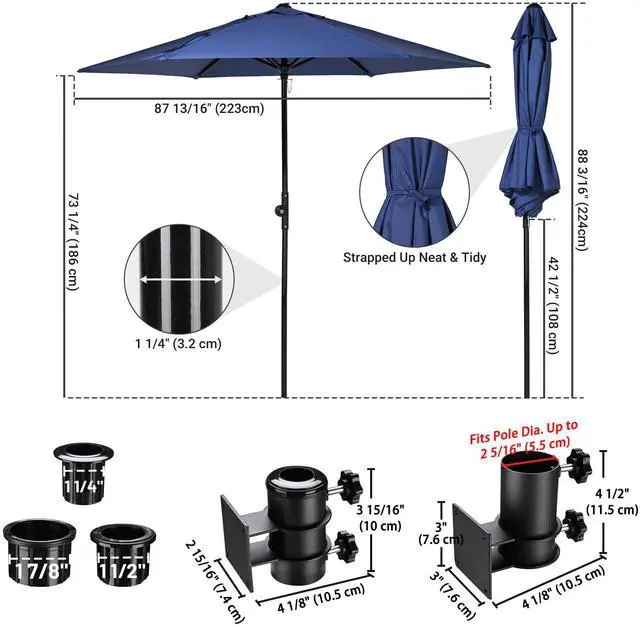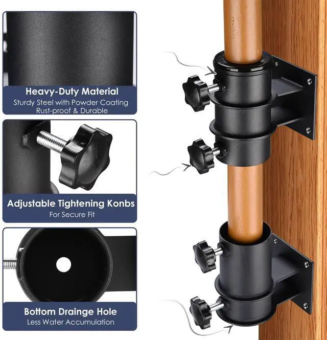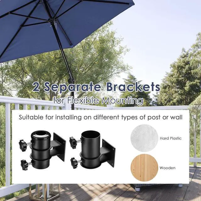 - Heavy Duty Universal Fit Brackets- Comes with a set of plastic sleeves to accommodate umbrella pole sizes from 1 1/4" to 2 5/16" in diameter; Crafted from sturdy powder-coated steel for rust resistance, this umbrella brackets are tough enough for longtime outdoor use