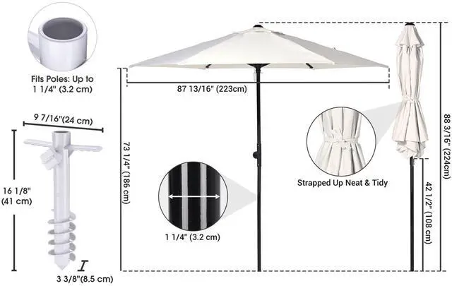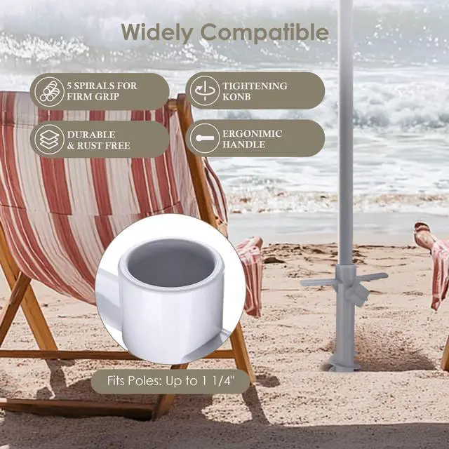 - 5-Spiral Sand Anchor - Comes with 5 spirals for a firmer grip in the sand, grass, or soft dirt to hold your umbrella securely, along with a large thumbscrew for tool-free setup in minutes by simply twisting the anchor into the sand, then inserting the umbrella pole