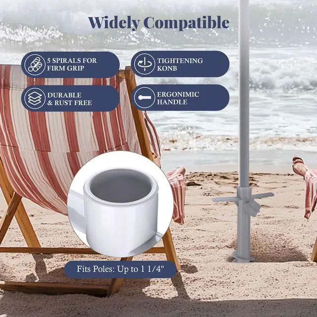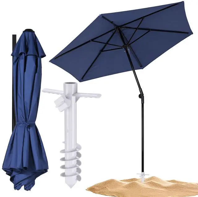 - 5-Spiral Sand Anchor - Comes with 5 spirals for a firmer grip in the sand, grass, or soft dirt to hold your umbrella securely, along with a large thumbscrew for tool-free setup in minutes by simply twisting the anchor into the sand, then inserting the umbrella pole