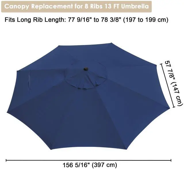 - Universal Cover Replacement - 13 ft Universal Replacement Umbrella Canopy fits 13ft umbrella with 8 ribs measuring 77 9/ 16" to 78 3/8" in length, boasting vibrant estate blue shade for freshening up your umbrella while infusing your outdoor space with a relaxed resort vibe