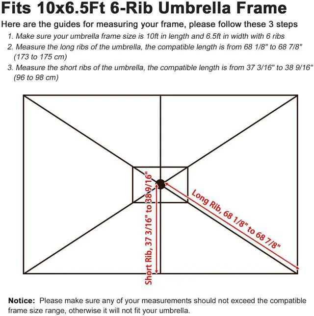 - Compatibility - Universal Replacement Umbrella Canopy fits 10x6.5ft 6-rib patio umbrella with long rib length from 5 2/3 to 5 3/4ft and short rib length from 3 1/6 to 3 1/4ft, also compatible with our umbrella model YES0292, YES0313 and YES0315; It features a rectangular design with bright yellow color for modern stylish style which matches well with different beach chairs to deliver a summer coastal vibe
