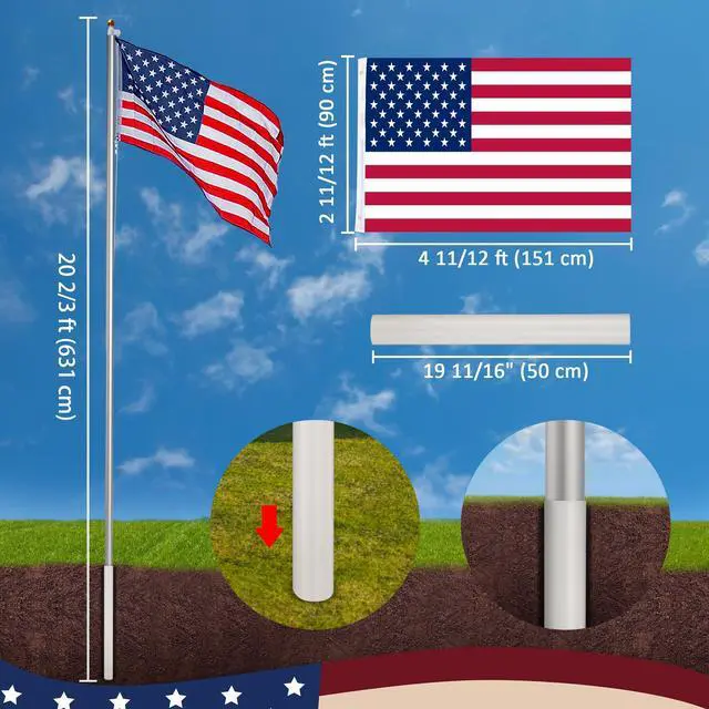 - Freely Fly Your American Pride: 20ft aluminum sectional Flagpole Kit with a golden top finial; Ideal for front yard, garden, patio and commercial use. Also suitable for holding cell booster antenna at the top & for tailgating/camping decoration