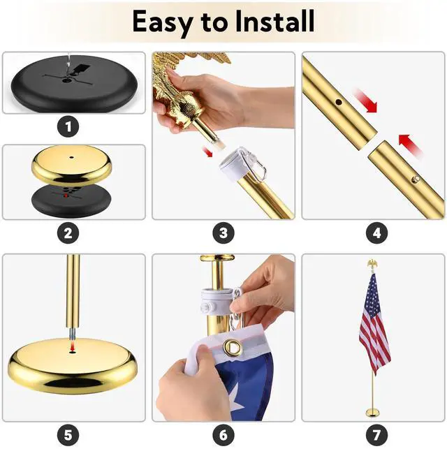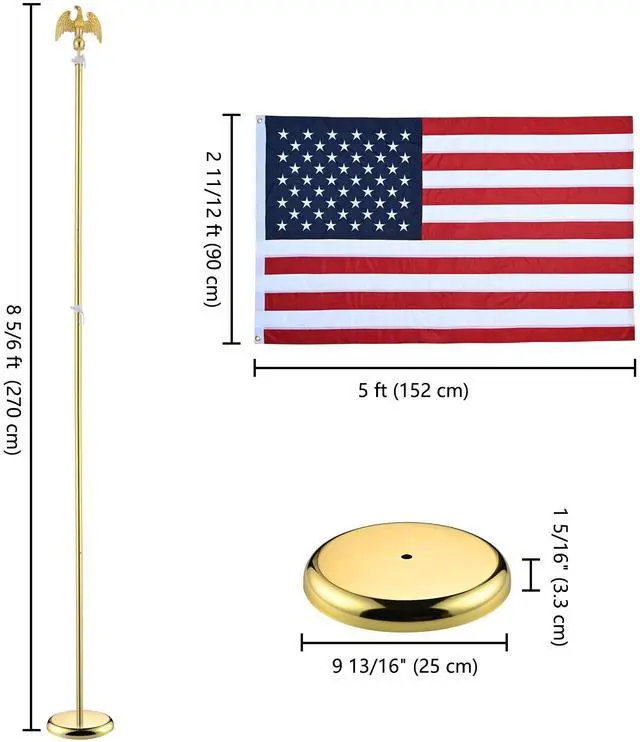 - Complete Flagpole Kit - Includes 4 pcs 8 ft indoor sectional flagpoles, 4 pcs gold eagle finials, 4 pcs American national flags, 4 pcs base stands and accessories, one package for everything you need to display national flag indoors, perfect decoration for government agencies, institutions, corridor, hallway, office, embassy, school, city hall, church, military ceremony for veterans