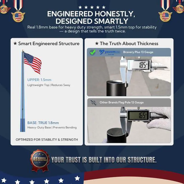 - 13 Gauge Solid Construction - 20ft Aluminum Sectional Flagpole Kit with golden ball finial features upgraded 13 Gauge aluminum tubes for higher wind resistance, durability and rust resistance, ensuring longtime use in front yard, beside house, garden, patio