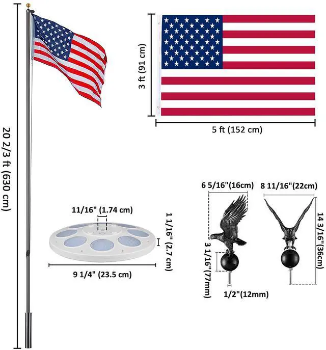 - Fly Your American Pride - 20ft aluminum sectional Flagpole Kit with a black top finial; Ideal for front yard, garden, patio and commercial use. Also suitable for holding cell booster antenna at the top & for tailgating/camping decoration