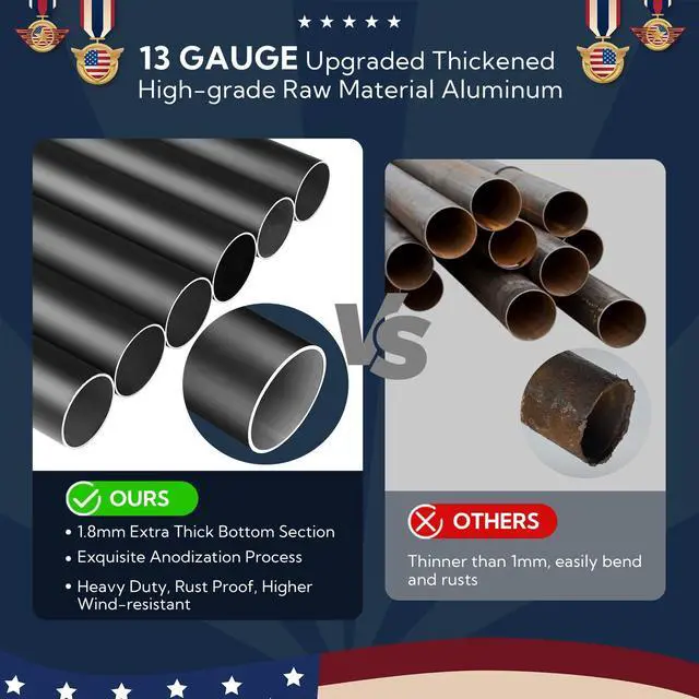 - 13 Gauge Solid Construction - 20ft Aluminum Sectional Flagpole Kit with golden ball finial features upgraded 13 Gauge aluminum tubes for higher wind resistance, durability and rust resistance, ensuring longtime use in front yard, beside house, garden, patio