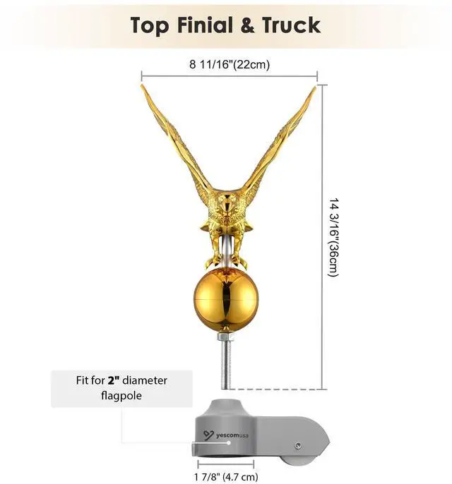 - Easy Installation - Simple and fast installation with following 4 steps: insert the truck to flagpole and fasten it with screw, tightly screw top ornament into truck, hang flag on rope with carabiners and put ropes onto pulley, finally install cleat and fixate rope on it; suitable for our flagpole models: YES0020, YES0021, YES0026