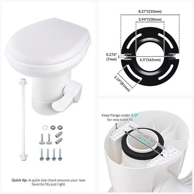 - Foot Pedal Flush 3 Packs of RV Gravity Flush Toilets, designed for travelling, are easy to use by stepping on the foot pedal half way for adding water and full activation to provide a full-bowl coverage flush. Please confirm your current flange has 6 11/16" bolt spacing with under 1/2" protrusion height above the floor to ensure a proper match