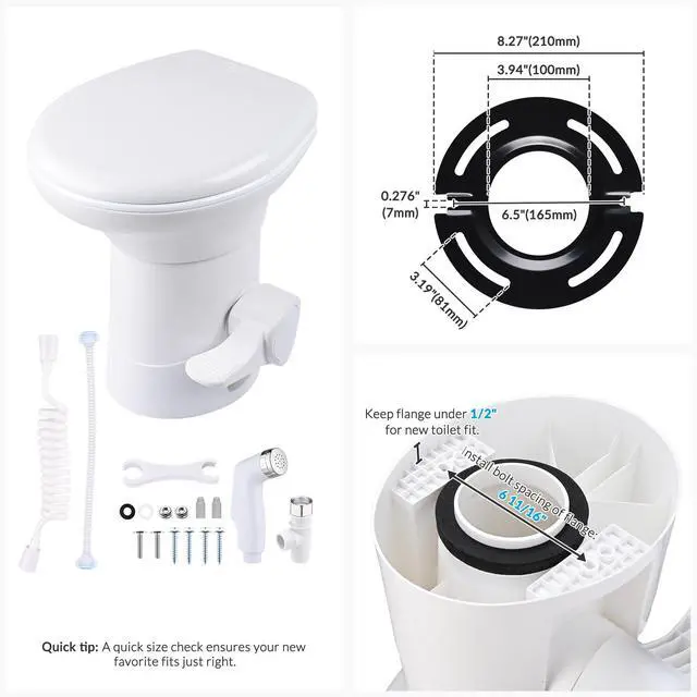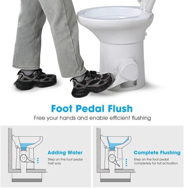 - Effortless Foot-Pedal Flush - RV Gravity Flush Toilet, designed for travel, provides the convenience of a residential toilet on the go with an easy-to-use foot pedal. A gentle step adds water, while a full press delivers a powerful, complete flush, all without electricity.Please confirm your current flange has 6 11/16" bolt spacing with under 1/2" protrusion height above the floor to ensure a proper match