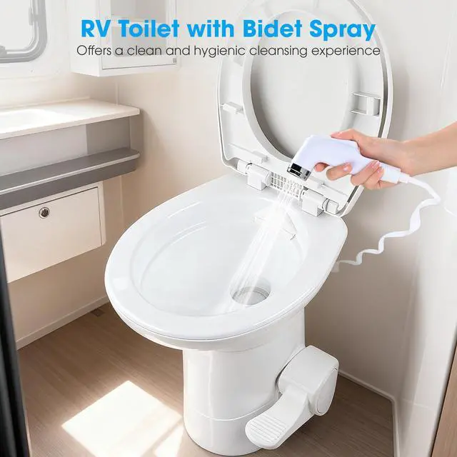 - Refreshing Bidet Cleanliness - Elevate your RV hygiene with the included bidet sprayer, enabling a more comfortable and refreshing experience than traditional toilet paper. Optimized design allows dispersed flushing coverage for more thorough cleaning with only 0.05L of fresh water per flush, reducing water consumption