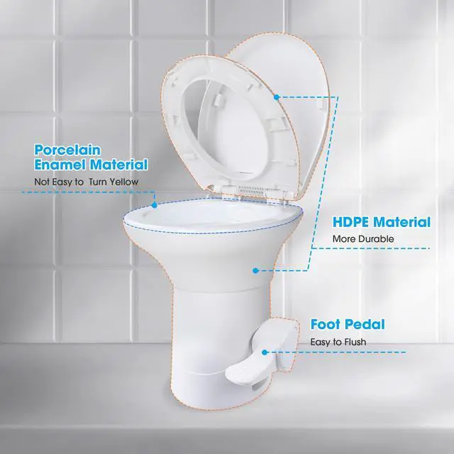 - Household Toilet Comfort - 20" extra tall RV camper toilet features a full-size, residential-style seat for ultimate comfort on the road. The easy-to-open/close lid adds a touch of home, while the sleek, modern design enhances your RV's interior