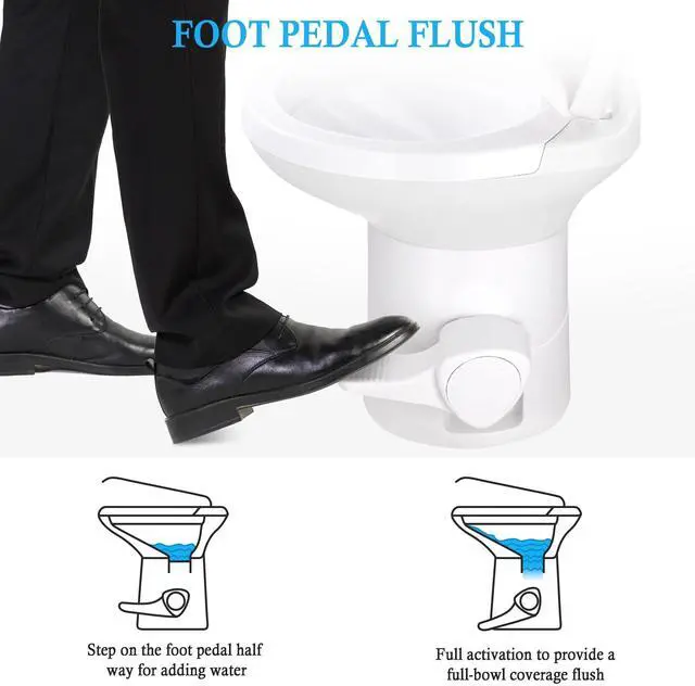 - Foot Pedal Flush - RV Gravity Flush Toilet, designed for travelling, is easy to use by stepping on the foot pedal halfway for adding water and full activation to provide a full-bowl coverage flush