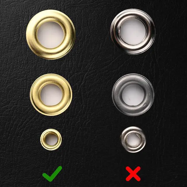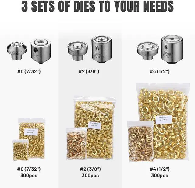 - Upgraded Solid Brass Grommets & Washers - Grommet Tool Kit includes 300 sets each of #0/#2/#4 solid brass grommets and washers, rust-proof for outdoor use on fabrics, leather, denim, tarps, canvas & vinyl, etc.
