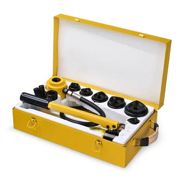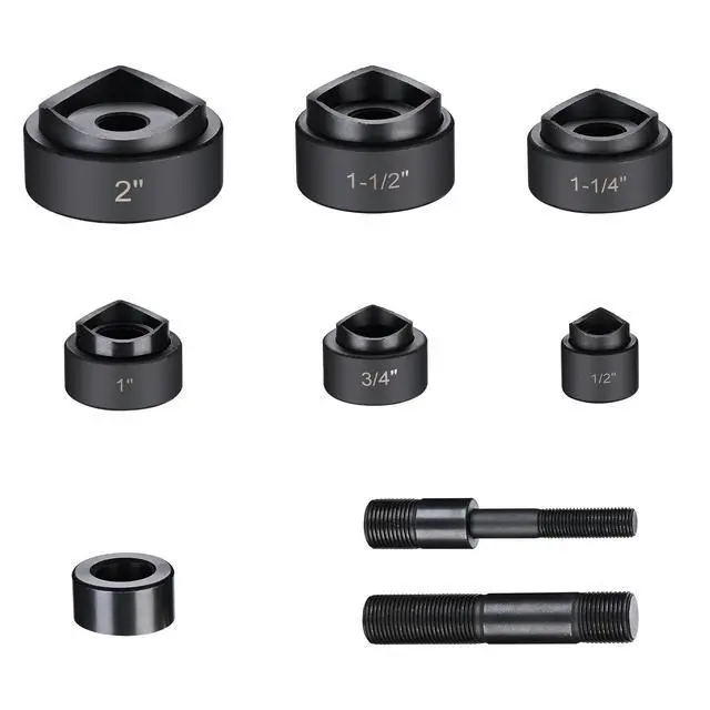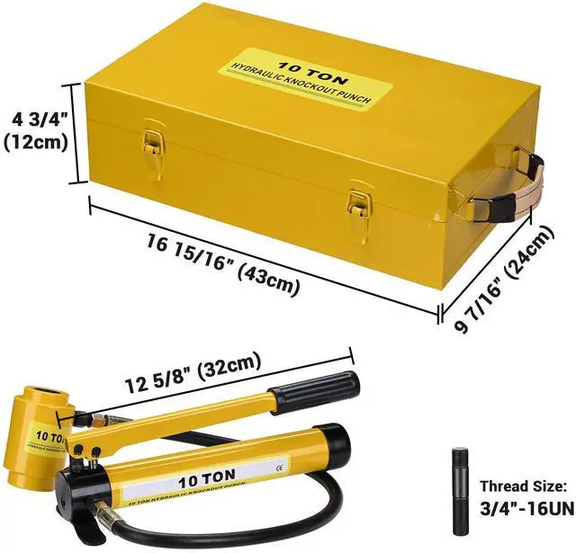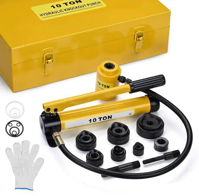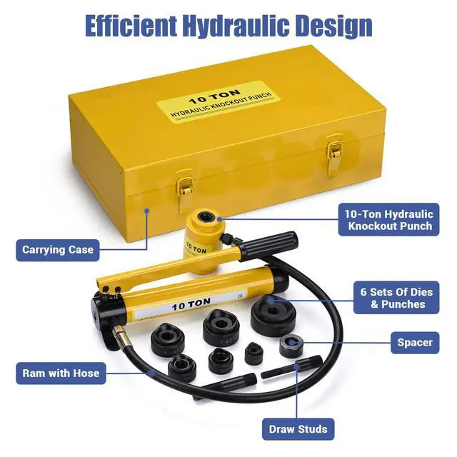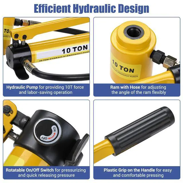 Features:- Complete Set - This 10-ton Hydraulic Punch Driver Kit features a 10-ton pump, 2 draw studs, 1 spacer & 6 sets of interchangeable dies & punches, designed to fit 1/2", 3/4", 1", 1 1/4", 1 1/2" & 2" conduit sizes, enabling hole drilling on stainless steel, iron, steel, aluminum, etc.