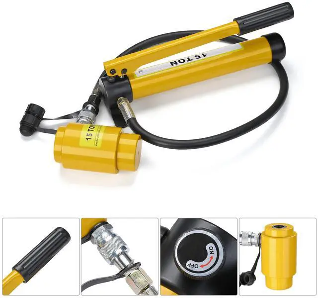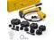 - Hydraulic punch tool kit features 1pc 15-ton pump, 2pcs draw studs, 1pc spacer and 10 sets of interchangeable dies & punches