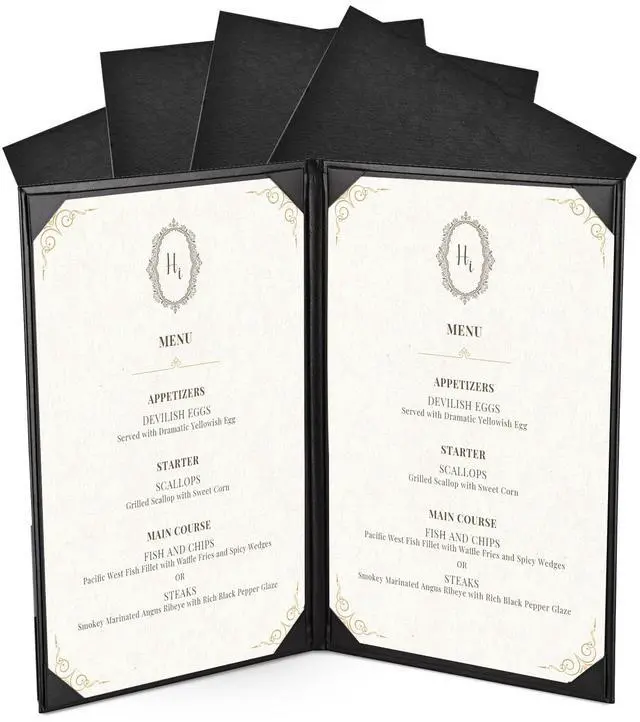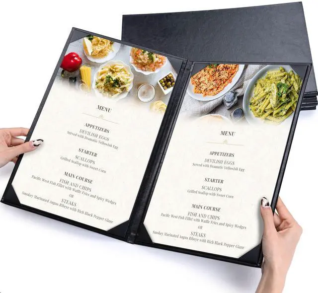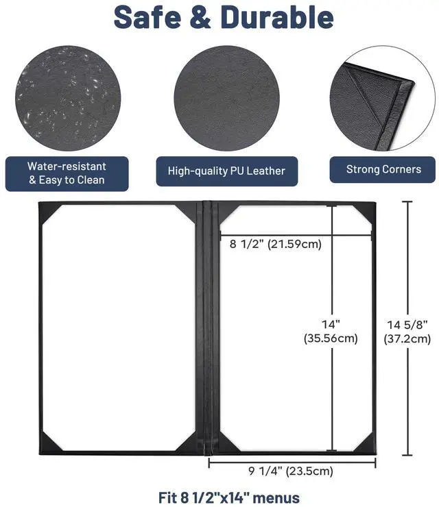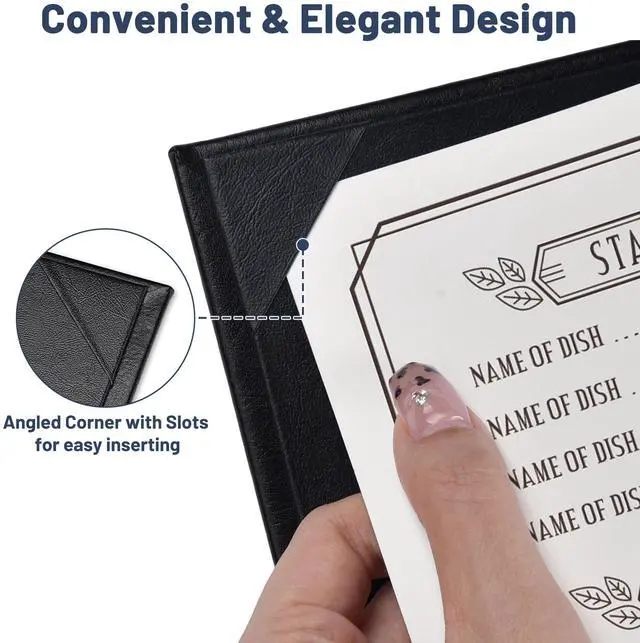 - Convenient & Elegant Design - Features 4 angled corners on each panel with slots for easy inserting the menu sheet and fixing it firmly, along with elegant leatherette trim for upgrading your taste and style instantly and leaving a deep impression on customersr>- Safe & Sturdy - Constructed by high-quality PU leather, the menu cover is safe, odorless, wear-and-tear resistant and non-shattering for ensuring long-lasting use and retaining a consistent appearance