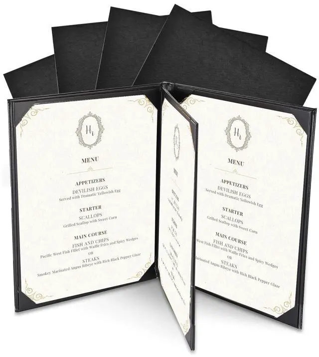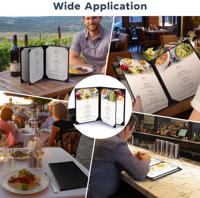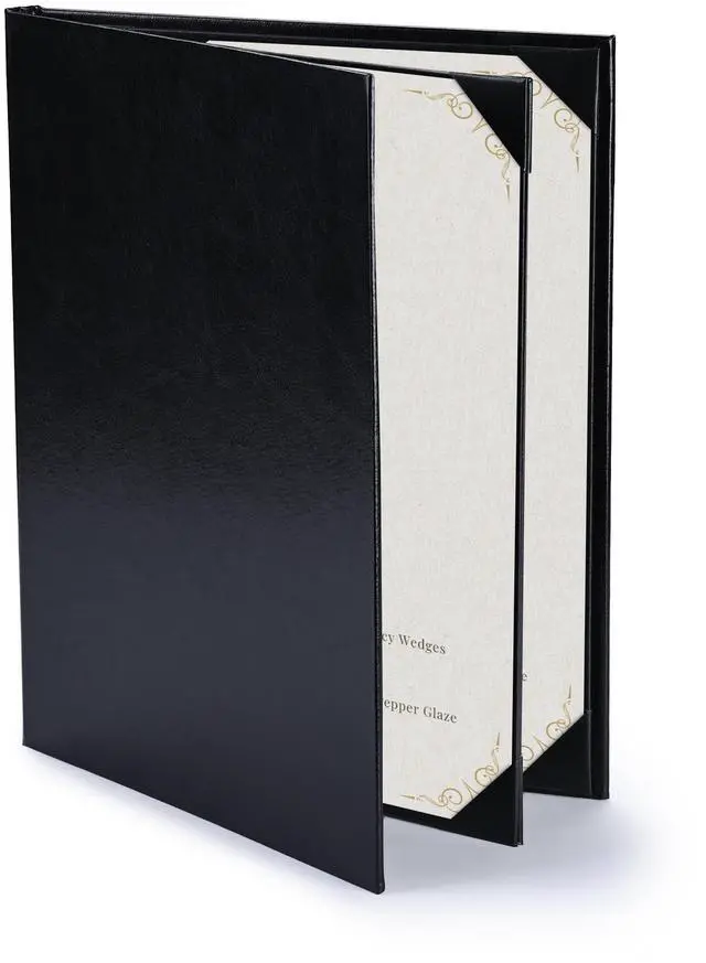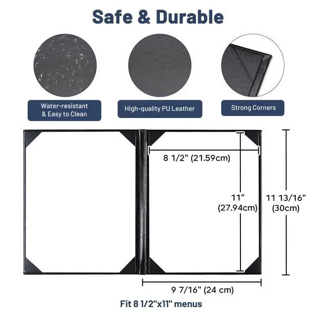 - Convenient & Elegant Design - Features 4 angled corners on each panel with slots for easy inserting the menu sheet and fixing it firmly, along with elegant leatherette trim for upgrading your taste and style instantly and leaving a deep impression on customersr>- Safe & Sturdy - Constructed by high-quality PU leather, the menu cover is safe, odorless, wear-and-tear resistant and non-shattering for ensuring long-lasting use and retaining a consistent appearance