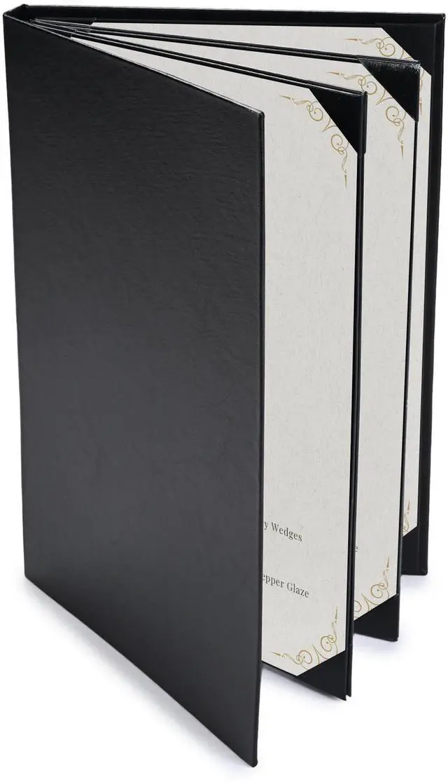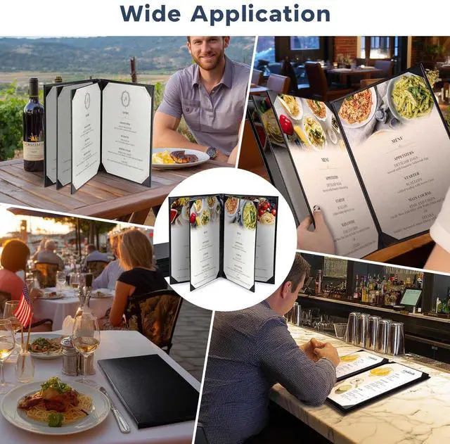 - Convenient & Elegant Design - Features 4 angled corners on each panel with slots for easy inserting the menu sheet and fixing it firmly, along with elegant leatherette trim for upgrading your taste and style instantly and leaving a deep impression on customersr>- Safe & Sturdy - Constructed by high-quality PU leather, the menu cover is safe, odorless, wear-and-tear resistant and non-shattering for ensuring long-lasting use and retaining a consistent appearance