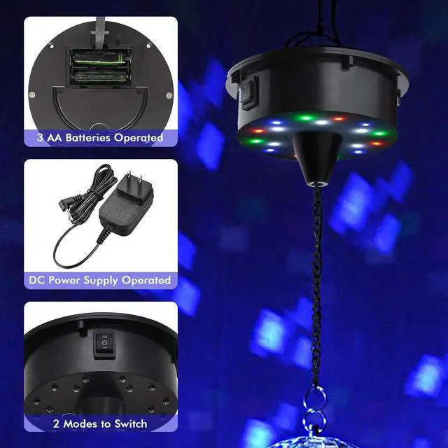- Rotating Motor with 4-Color LEDs - The motor features 18 LED beads in 4 colors to cast colored lights on the mirror ball for glittering lighting effects; Also comes with a sound sensor to catch the rhythm, making the light move and shift along with music
