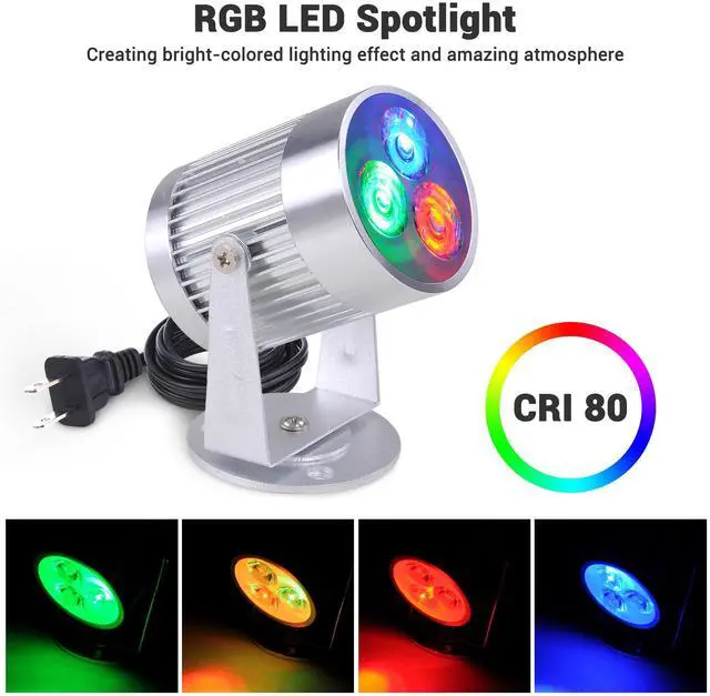 - RGB LED Spotlight - 2 3/16" x 3 13/16" LED spotlight features RGB (Red/Green/Blue) color with high color rendering index up to 80 for bright-colored lighting effect; Also features low power consumption for energy saving, and long lifespan up to 50,000 hrs