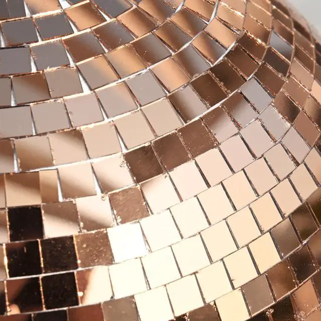- Rose Gold Ball - 12" Disco Ball is covered with rose gold mirror tiles to catch and refract light into a cascade of blushing beams; The ball comes with a hanging ring for suspending it on ceilings, trees, or any desired location