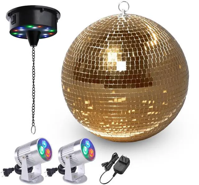 - Disco Ball Kit - Yescom Mirror Ball kit comes with a 12 golden mirror ball, 2 RGB spotlights, and a rotating motor for creating a dynamic and mesmerizing display for bars, nightclubs, etc.